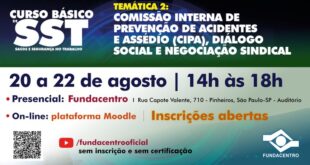 Por FUNDACENTRO Estão abertas as inscrições para a temática 2, Comissão Interna de Prevenção de Acidentes e Assédio (Cipa), Diálogo Social e Negociação Sindical, do curso Básico de Saúde e Segurança na Trabalho (SST). O prazo de inscrição vai até as 10h, do dia 19 de agosto ou até o preenchimento total das vagas. As aulas acontecem de 20 a …