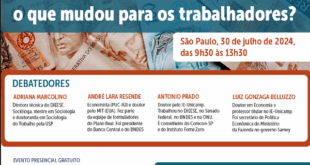 Por DIEESE online Participe do seminário nacional Plano Real 30 anos: o que mudou para os trabalhadores? O evento é gratuito. Será realizado em 30 de julho, das 9h30 às 13h30, no Auditório da Escola DIEESE, em São Paulo, e transmitido ao vivo no canal da Escola DIEESE no YouTube. Confirme presença no site da Escola DIEESE: https://sagu.dieese.org.br/competo/turmas_abertas Programação9h30 | …