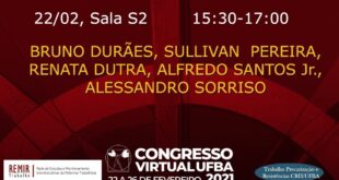 Por Congresso Virtual UFBA 2021 Participe da Mesa “Pandemia e Trabalho: quais formas de resistência?”, que acontecerá dia 22/02, às 15:30hrs na sala S2 do Congresso Virtual UFBA 2021. A mesa contará com as participações de Bruno Durães, Sullivan Pereira, Renata Dutra, Alfredo Santos Jr. e Alessandro Sorriso. Clique aqui e participe do evento dia 22/02 às 15:30hrs
