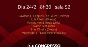Por Congresso Virtual UFBA 2021 Participe da Mesa “Reivindicações, Greves e Protestos no contexto da pandemia do coronavírus”, que acontecerá dia 24/02, às 8:30hrs na sala S2 do Congresso Virtual UFBA 2021. A mesa contará com as participações de Davisson C. Cangussu de Souza (Unifesp), Luís Ribeiro (DIEESE), Patrícia Trópia (UFU / ABET), Ricardo Festi (UnB) e Sirlei Oliveira (DIEESE) …