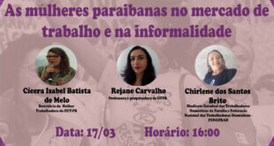 Por Observatório do Mercado de Trabalho e da Informalidade na Paraíba Acontecerá na próxima quarta-feira (17/03) a conferência “As Mulheres Paraibanas no Mercado de Trabalho e na Informalidade”. O evento contará com as participações de Cícera Isabel Batista de Melo (Secretaria da Mulher Trabalhadora – CUT-PB), Rejane Carvalho (professora e pesquisadora da UFPB) e Chirlene dos Santos Brito (Sindicato Estadual …