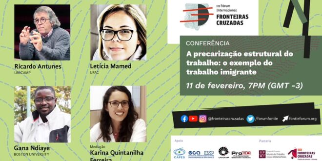 A proposta da conferência é abordar as dinâmicas precarizantes e estruturais do trabalho contemporâneo, em escala global e no Brasil, em particular a condição do trabalho imigrante. Como convidados debatedores, a atividade conta com a participação da pesquisadora e professora Letícia Mamed da Universidade Federal do Acre (UFAC), líder do grupo de pesquisa Mundos do Trabalho na Amazônia, e do pesquisador Gana Ndiaye, doutorando em antropologia social e cultural pela Universidade de Boston, EUA, com pesquisa sobre a informalidade, racialização e etnografia da migração senegalesa no Brasil. Organizado em parceria com pesquisadoras do grupo Metamorfoses do Mundo do Trabalho (UNICAMP) e projeto de extensão Fronteiras Cruzadas (UNICAMP). Saiba mais em nosso Blog: https://www.fontieforum.org/forum-fro…”