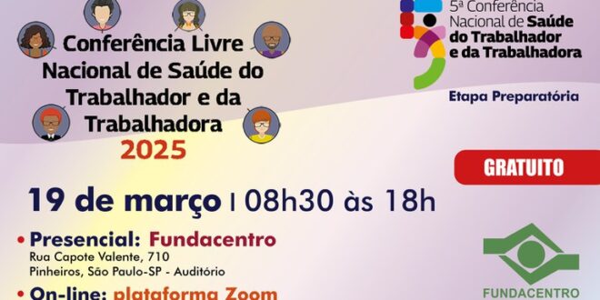 A Conferência Livre Nacional de Saúde do Trabalhador e da Trabalhadora, etapa preparatória da 5ª Conferência Nacional de Saúde do Trabalhador e da Trabalhadora, ocorre em 19 de março, das 8h30 às 18h, na Fundacentro, em São Paulo/SP, em formato híbrido. Para participar, inscreva-se pelo formulário.