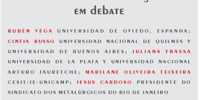O Arquivo de Memória Operária do Rio de Janeiro (AMORJ-UFRJ) e a Associação Brasileira de Estudos do Trabalho (ABET) convidam para a mesa virtual: Desindustrialização em debate com a presença dos professores Rubén Vega (Universidad de Oviedo-Espanha); Cintia Russo (Universidad Nacional de Quilmes y Universidad de Buenos Aires), Juliana Frassa (Universidad de La Plata y Universidad Nacional Arturo Jauretche); Marilane Teixeira (Cesit-IE-Unicamp) e Jesus Cardoso, (presidente do Sindicato dos Metalúrgicos do RJ).