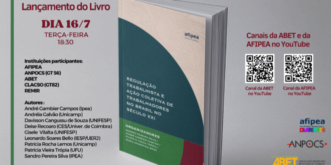 No dia 16 de julho de 2024, às 18:30 , pelos Canais da ABET e da AFIPEA no YouTube (https://www.youtube.com/watch?v=SFOnrLU8EQg), será lançada a coletânea Regulação Trabalhista e Ação Coletiva de trabalhadores no Brasil no Século XXI , organizada por Sandro Pereira Silva (IPEA), André Gambier Campos (IPEA), Patrícia Vieira Trópia (UFU) e Maria Aparecida Bridi (UFPR).