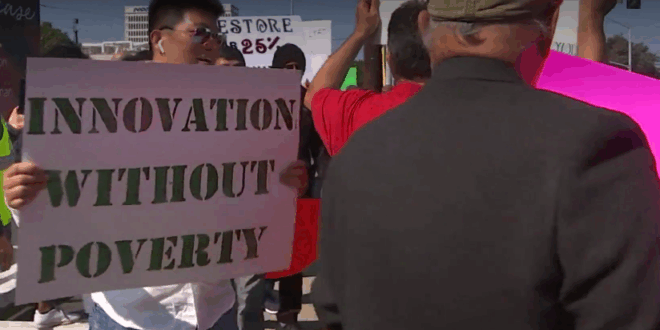 “Alguns motoristas do Uber e do Lyft em Los Angeles realizaram uma greve de 25 horas na segunda-feira para protestar contra cortes de salários e condições de trabalho. A paralisação do trabalho foi estimulada pelo recente anúncio da Uber de um corte de 25 por cento no pagamento de motoristas por milha em Los Angeles e partes de Orange County.”