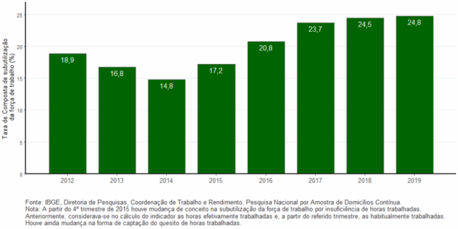 O número de pessoas subocupadas por insuficiência de horas trabalhadas chegou a cerca de 7,4 milhões no trimestre de abril a junho de 2019, um recorde da série histórica. Houve um aumento de 8,7% em relação ao trimestre anterior, ou mais 587 mil subocupados. Em relação ao mesmo trimestre do ano anterior houve uma alta de 13,8%, o equivalente a mais 892 mil pessoas subocupadas.