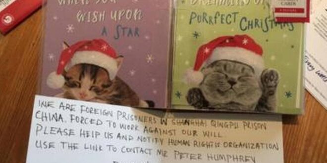 “Somos prisioneiros estrangeiros na prisão de Qingpu, em Xangai, China”, diz a mensagem, escrita em um cartão ilustrado com um gato usando gorro de Papai Noel. “Forçados a trabalhar contra a nossa vontade. Por favor, ajude-nos e notifique organizações de direitos humanos.”