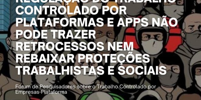 O Fórum de Pesquisadores sobre o Trabalho Controlado por Empresas-Plataforma – que reúne dezenas de acadêmicos/cas e estudiosos/as no tema e que vem acompanhando o debate do GT, mantendo diálogo com trabalhadores/as, entidades laborais e com autoridades sobre o tema – reforça que medidas (sejam elas legais, administrativas ou políticas) não podem gerar retrocessos ou, contribuir para aprofundar a precariedade do modelo imposto por essas empresas. Tal alerta faz-se ainda mais importante quando informações na imprensa dão conta de movimentações do governo federal de propor um projeto de lei poderá resultar na criação efetiva de uma terceira figura jurídica de direitos rebaixados.