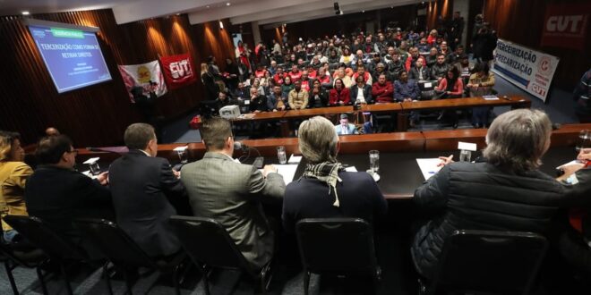 A discussão foi promovida pelo deputado estadual e Líder da Oposição Arilson Chiorato (PT), com a participação do deputado federal Tadeu Veneri (PT) e dos deputados estaduais Ana Júlia (PT) e Professor Lemos (PT). Também participaram centrais sindicais (CUT, Força Sindical, UGT e Nova Central), sindicatos e especialistas no tema da terceirização. Todos avaliaram a necessidade de enfrentar o modelo e buscar melhoria de vida para a classe trabalhadora com pautas como redução de jornada, fim da escala 6 por 1, isenção do imposto de renda para quem ganha até R$ 5 mil e defesa da soberania nacional como forma de enfrentar a agenda extremista mundial.