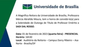 Por Associação Brasileira de Estudos do Trabalho (ABET) Ocorrerá a Solenidade de Outorga do Título de Professor Emérito ao Professor Sadi dal Rosso no dia 01/02/2023, às 16h30, no Auditório da Reitoria da Universidade de Brasília (UnB). A Associação Brasileira de Estudos do Trabalho (ABET) aproveita para saudar o Professor Sadi dal Rosso por este momento de reconhecimento de sua …