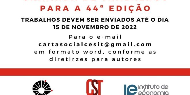 Os trabalhos a serem publicados na 44ª Edição devem ser enviados até o dia 15 de Novembro de 2022, através do e-mail da CST: cartasocialcesit@gmail.com