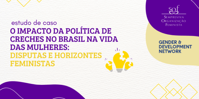 A construção de políticas de cuidado é uma questão atual em diversas partes do mundo, e não apenas no Brasil. Em 2023, junto a outras organizações feministas do Sul Global, sediadas na Zâmbia e na Índia, a SOF foi convidada a refletir sobre os desafios para a construção de políticas de cuidado no Brasil, como parte de um processo de elaboração do GADN Rede sobre Gênero e Desenvolvimento. Para isso, realizamos um estudo de caso sobre o cuidado infantil, articulando gênero, raça e classe em na análise de dados estatísticos nacionais e em um processo de reflexão coletiva com companheiras da Marcha Mundial das Mulheres. No texto discutimos a política de cuidado infantil, com foco nas creches, a partir de três perspectivas integradas sobre o direito ao cuidado: para as mulheres responsáveis pelas crianças, para as trabalhadoras de creche e para o cuidado, a educação e a segurança alimentar das crianças. Além de um diagnóstico da situação atual, incluindo as desigualdades regionais que marcam o acesso a creches no Brasil, o estudo aponta que, mais do que declarações, uma política de cuidado demanda investimento.
