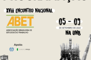 Está disponível a programação do XVIII ENCONTRO NACIONAL DA ABET É com muita alegria que convidamos os (as) associados (as) e interessados (as) para o XVIII Encontro Nacional da Associação Brasileira de Estudos do Trabalho, que ocorrerá na Universidade de Brasília, de forma presencial, entre os dias 5 e 9 de setembro de 2023. O tema central do XVIII Encontro …