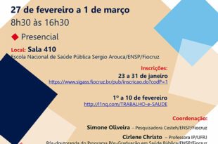 Por Fiocruz A partir da próxima segunda-feira, 23 de janeiro, estão abertas as inscrições para o Curso Internacional Trabalho na Contemporaneidade e Saúde: interseccionalidades e dinâmicas de mobilização coletiva perspectivas e desafios Brasil, França e Argentina. O curso acontecerá de forma presencial, na ENSP, de 27 de fevereiro a 1º de março. Os interessados devem se inscrever na Plataforma Sigass Fiocruz. Ao todo …