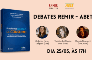 Por Associação Brasileira de Estudos do Trabalho Na próxima quarta-feira, dia 25/05, das 17h às 18h30, teremos a transmissão ao vivo de mais uma edição do Debates REMIR-ABET. A atividade marca o lançamento do livro “Plataformas Digitais de Consumo” e contará com a participação de duas das coautoras, Gabriela Neves Delgado (UnB) e Valéria de Oliveira Dias (UnB), mediadas por …