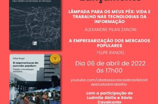 Por Associação Brasileira de Estudos do Trabalho (ABET) A Associação Brasileira de Estudos do Trabalho (ABET) te convida para o evento de lançamento dos dois livros vencedores do Prêmio ABET Lâmpada para os meus pés: vida e trabalho nas tecnologias da informação de Alexandre Pilan Zanoni A empresarização dos mercados populares de Felipe Rangel Com a presença dos autores e …