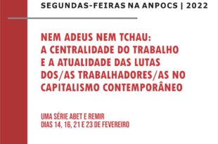 “Nem adeus nem tchau: a centralidade do trabalho e a atualização das lutas dos/as trabalhadores/as no capitalismo contemporâneo” Série de lives da “Associação Nacional de Pós-graduação e Pesquisa em Ciências Sociais – ANPOCS” em parceria com a “Rede de Estudos e Monitoramento da Reforma Trabalhista – REMIR” e a “Associação Brasileira de Estudos do Trabalho – ABET”. As lives acontecerão …