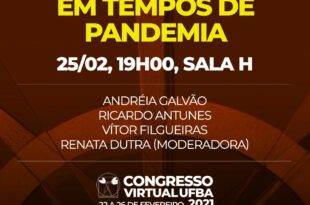 Por Congresso Virtual UFBA 2021 Participe da Mesa “O trabalho em tempos de pandemia”, que acontecerá dia 25/02, às 19hrs na sala H do Congresso Virtual UFBA 2021. A mesa contará com as participações de Andreia Galvão, Ricardo Antunes, Vitor Filgueiras e moderação de Renata Dutra. Clique aqui e participe do evento dia 25/02 às 19hrs