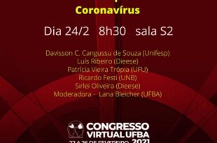 Por Congresso Virtual UFBA 2021 Participe da Mesa “Reivindicações, Greves e Protestos no contexto da pandemia do coronavírus”, que acontecerá dia 24/02, às 8:30hrs na sala S2 do Congresso Virtual UFBA 2021. A mesa contará com as participações de Davisson C. Cangussu de Souza (Unifesp), Luís Ribeiro (DIEESE), Patrícia Trópia (UFU / ABET), Ricardo Festi (UnB) e Sirlei Oliveira (DIEESE) …