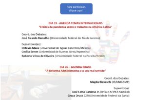 Por ABET | REMIR DEBATES REMIR-ABETAgenda de Outubro DIA 19/10 | 16hrs | AGENDA TEMAS INTERNACIONAIS“Efeitos da pandemia sobre o trabalho na América Latina” Coord. dos Debates: José Ricardo Ramalho (UFRJ) Expositores(as): Octávio Maza (Universidad de Aguas Calientes/México) Cecilia Senen (Universidad de Buenos Aires/Argentina) Roberto Véras de Oliveira (Universidade Federal da Paraíba/Brasil) DIA 26/10 | 16hrs | AGENDA BRASIL“A Reforma …