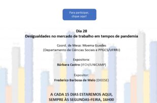 Por ABET | REMIR DEBATES REMIR-ABET Desigualdades no mercado de trabalho em tempos de pandemia Coord. de Mesa: Moema Guedes (Departamento de Ciências Sociais e PPGCS/UFRRJ) Expositora: Bárbara Castro (IFCH/UNICAMP) Expositor: Frederico Barbosa de Melo (DIEESE) Essa é uma proposta do Grupo Temático 13 da ABET “Dinâmicas sociodemográficas e Trabalho” | Coordenação: Eugenia Leone e Moema Guedes Clique aqui e …