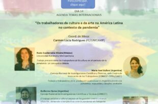 Por ABET | REMIR Debate REMIR-ABET Os trabalhadores da cultura e da arte na América Latina no contexto da pandemia Coord. de Mesa: Carmen Lúcia Rodrigues (FE/UNICAMP) Debatedores: Rocío Guadarrama Olivera (México)Universidad Autónoma Metropolitana“Trabajo precario entre los trabajadores de la cultura en el contexto de la pandemia. Un concepto a debate.” Maria Noel Bulloni (Argentina)Consejo Nacional de Investigaciones Científcas y …