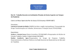 Por ABET | REMIR O Grupo de Trabalho 8 – Trabalho e Educação abre o ciclo de debates da ABET em parceria com a REMIR, no dia 10 de Agosto, às 16hrs. Com o tema “Trabalho docente em instituições privadas de ensino superior em tempos de pandemia”, o primeiro debate deste ciclo contará com os seguintes participantes: Aparecida Neri de …