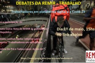 Continuando com uma série de eventos online durante o período da pandemia provocada pelo coronavírus, o evento online desta sexta-feira (01/05) discutirá aspectos relacionados aos trabalhadores em plataforma digital e a Covid-19. Durante o debate será apresentada uma nota da Rede de Estudos e Monitoramento da Reforma Trabalhista (REMIR) às Instituições da República, informe sobre a pesquisa “Trabalhadores em aplicativos…”, …