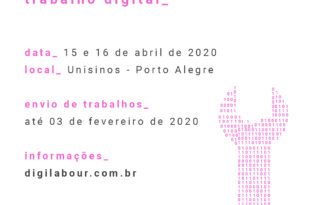 Por DigiLabour “Anunciamos chamada de trabalhos para o I DigiLabour: Simpósio Brasileiro de Trabalho Digital, que ocorrerá nos dias 15 e 16 de abril de 2020 na UNISINOS Porto Alegre. Todas as informações estão em https://digilabour.com.br – site e newsletter sobre trabalho digital. Será um evento interdisciplinar organizado pelo Programa de Pós-Graduação em Ciências da Comunicação com o objetivo de discutir as múltiplas dimensões do mundo do trabalho …