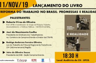 Acontecerá hoje (11/11), às 18h30 , no auditório do CH, da Universidade Federal de Campina Grande, o lançamento do livro “Reforma do Trabalho no Brasil: Promessas e Realidade”. O evento contará com a participação de convidados que discutirão sobre o mundo do trabalho nas mais diversas perspectivas.