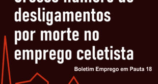 Por DIEESE Crescem os desligamentos por morte no emprego celetista. Médicos e enfermeiros e trabalhadores em atividades de educação e transporte são os mais afetados Entre os primeiros trimestres de 2020 e 2021, os desligamentos por morte do emprego celetista cresceram 71,6%. Nas atividades de atenção à saúde humana, o crescimento foi de 75,9%. Entre os médicos, os desligamentos por …